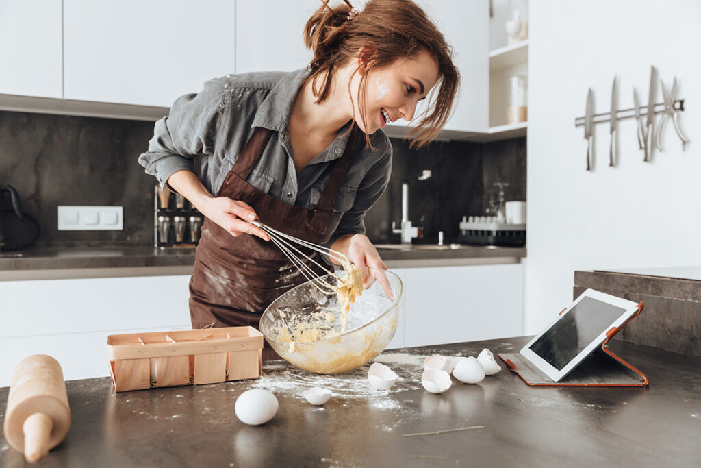 Image of young cheerful woman standing in kitchen and cooking the dough. Looking at tablet computer.