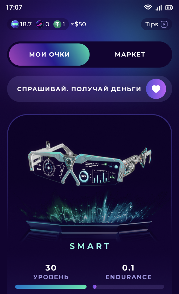 Скоро очки разрядились🪫 Оказывается, что у них есть такое свойство, но они быстро перезаряжаются. Для 100% нужно ждать всего сутки (я считаю, что это не особо долго). Покопавшись в аппке, узнал, что можно купить более редкие очки: приобретение поможет получать больше монет. Решил посмотреть варианты. Тогда на маркете были smart и simple. Некие rare все раскупили! smart стоили дешевле всего, $10,3. Именно их я взял себе.